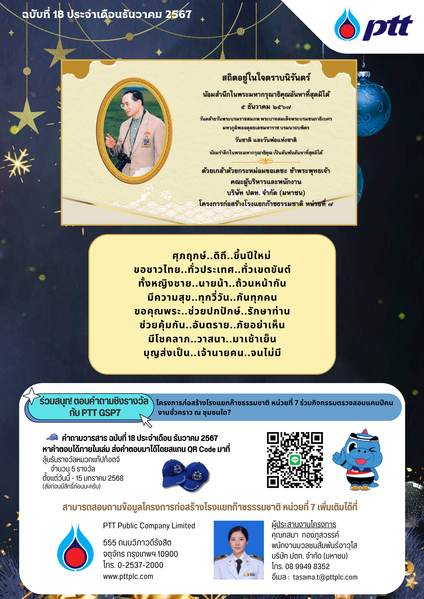 วารสารประชาสัมพันธ์โครงการก่อสร้างโรงแยกก๊าซธรรมชาติ หน่วยที่ 7 บริษัท ปตท. จำกัด (มหาชน) ฉบับที่ 18 ประจำเดือน ธันวาคม 2567 plazaradio 29/12/2024 วารสารประชาสัมพันธ์