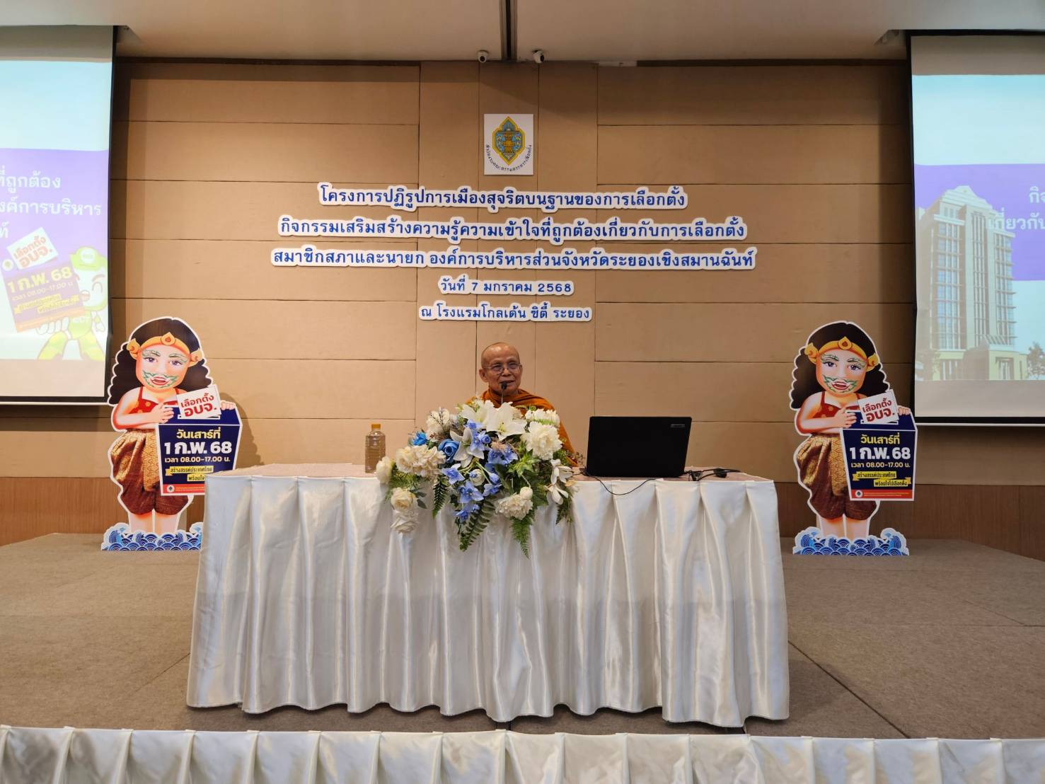 อีกทั้งได้นิมนต์ พระเทพสิทธิเวที เจ้าคณะจังหวัดระยอง มาปาฐกถาเรื่อง ปัญญา สัจจะ เสียสละ ทำงานเพื่อสังคมด้วย นายใจเพชร ผอ.กกต.จังหวัดระยอง ได้เปิดเผยว่า การลงคะแนนตรงกับวันเสาร์ วันที่ 1 ก.พ. 2568 คาดว่าจะมีประชาชนมาใช้สิทธิ์จำนวนมาก ซึ่งได้ตั้งเป้าการมาใช้สิทธิ์ของประชาชนในครั้งนี้ไม่น้อยกว่าร้อยละ 65 ขณะที่การกระทำผิดกฎหมายการเลือกตั้งในพื้นที่ตอนนี้ยังไม่มีการกระทำผิดแต่อย่างใด