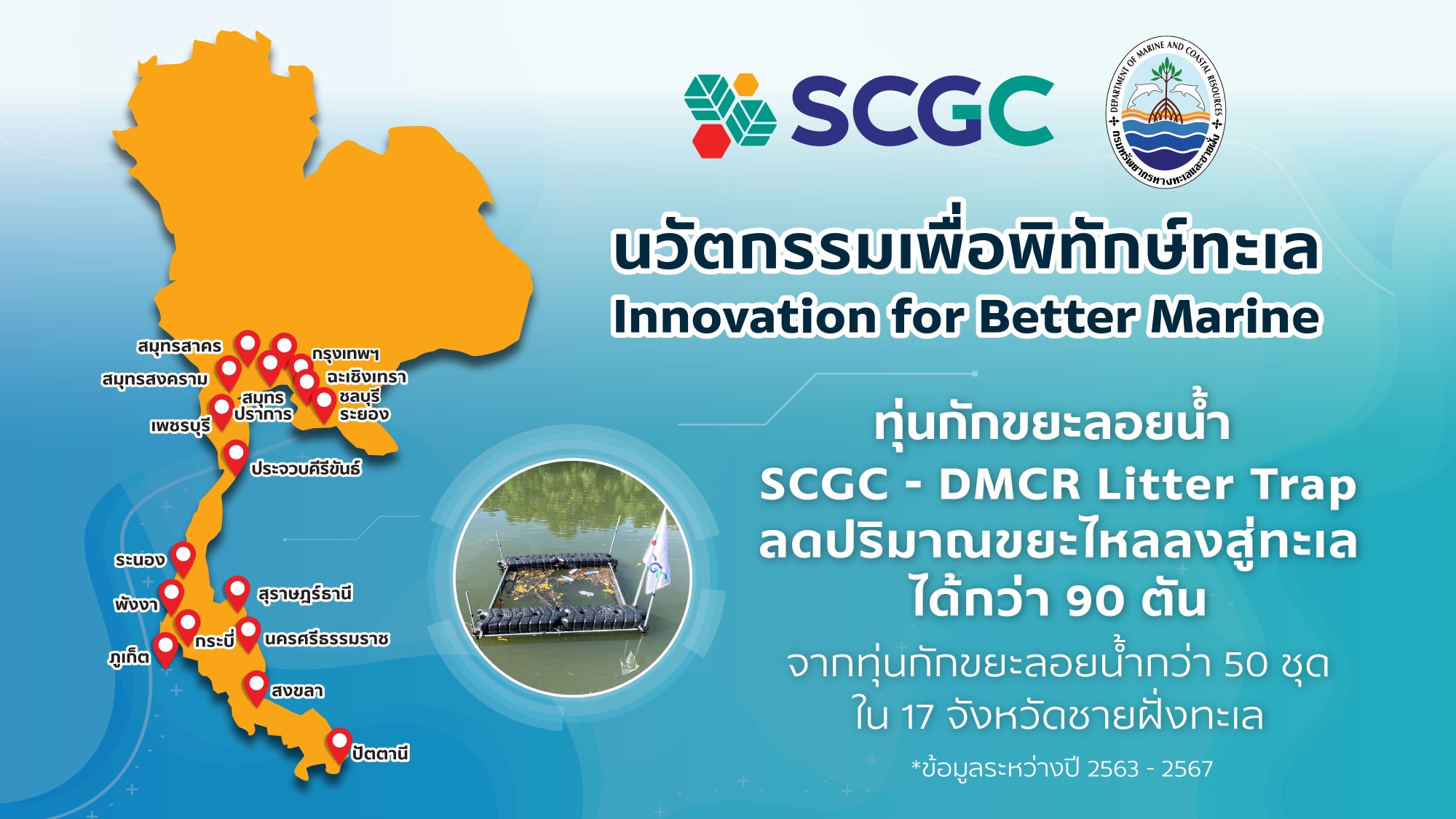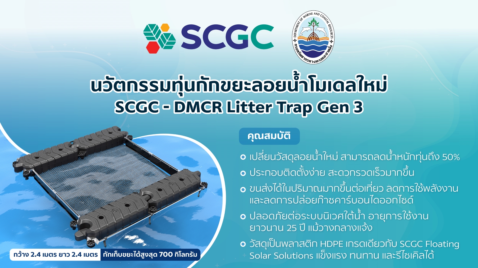 พร้อมกันนี้ SCGC ได้ส่งมอบทุ่นกักขยะลอยน้ำโมเดลใหม่ล่าสุด “SCGC – DMCR Litter Trap Gen 3” จำนวน 25 ชุด ให้กับกรมทรัพยากรทางทะเลและชายฝั่ง (ทช.) กระทรวงทรัพยากรธรรมชาติและสิ่งแวดล้อม เพื่อนำไปกักขยะลอยน้ำบริเวณปากแม่น้ำลำคลองสาขาต่าง ๆ ไม่ให้หลุดรอดสู่ทะเล โดยระหว่างปี 2563 จนถึงปี 2567 (ข้อมูล ณ ธันวาคม 2567) SCGC ได้ส่งมอบทุ่นกักขยะฯ ไปแล้วกว่า 50 ชุด ติดตั้งใน 17 จังหวัด สามารถลดปริมาณขยะบกไหลลงสู่ทะเลได้กว่า 90 ตัน ซึ่งมีส่วนช่วยป้องกันและเพิ่มความหลากหลายทางชีวภาพให้กับระบบนิเวศทางทะเล