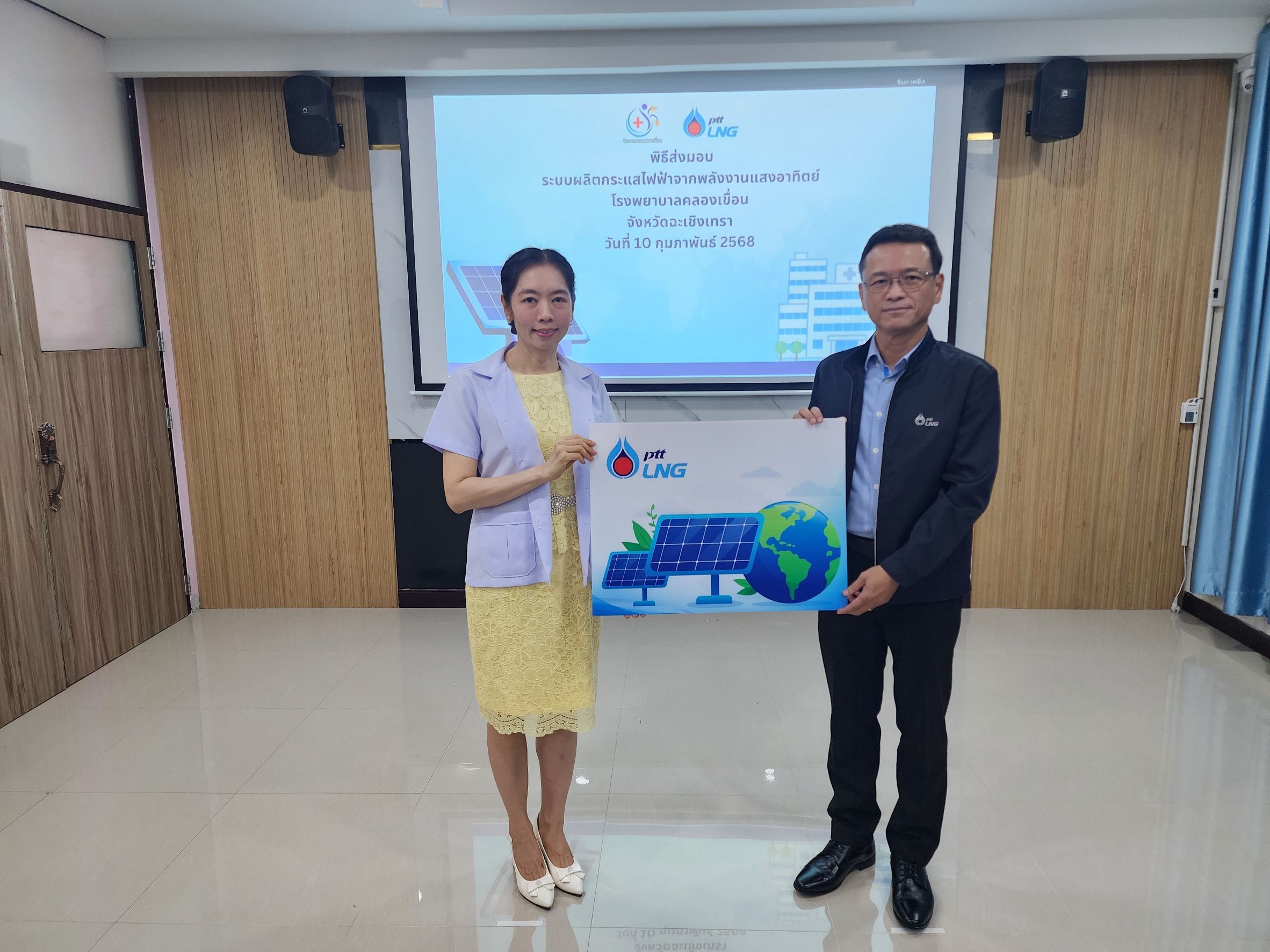 บริษัท พีทีที แอลเอ็นจี จำกัด ส่งมอบระบบผลิตไฟฟ้าจากพลังงานแสงอาทิตย์ หรือโซล่าร์เซลล์ ให้กับโรงพยาบาลคลองเขื่อน จังหวัดฉะเชิงเทรา โดยมีคุณสมชาย ระมาศ รองกรรมการผู้จัดการใหญ่วิศวกรรมและบำรุงรักษา บริษัท พีทีที แอลเอ็นจี จำกัด เป็นผู้ส่งมอบให้กับ แพทย์หญิงวิพัชรินทร์ ทรงเดชาพิพัฒน์ ผู้อำนวยการโรงพยาบาลคลองเขื่อน โดยพิธีการส่งมอบระบบผลิตไฟฟ้าจากพลังงานแสงอาทิตย์ ได้ดำเนินไปเมื่อวันที่ 10 กุมภาพันธ์ พ.ศ. 2568