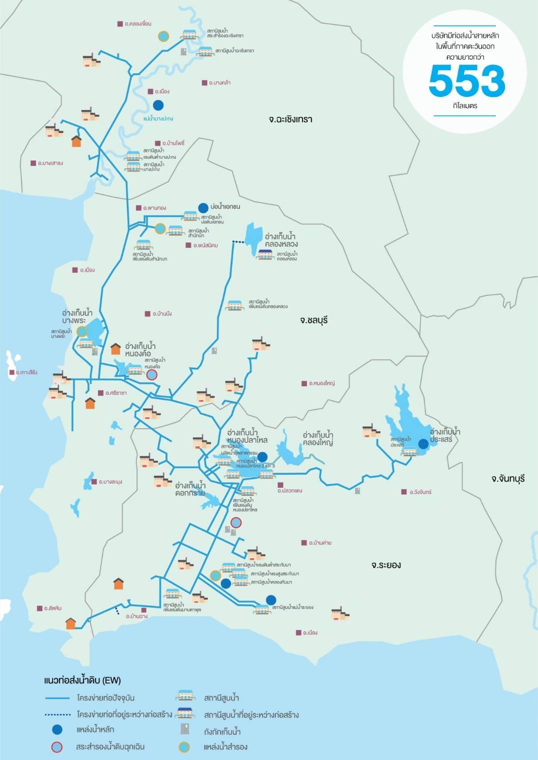อีสท์ วอเตอร์ ชี้แจงการก่อสร้างขุดว่างท่อส่งน้ำริมถนนสาย 331 พื้นที่ต.แม่น้ำคู้ อ.ปลวกแดง ต.นิคมพัฒนา อ.นิคมพัฒนา ระยะทางกว่า 10 กิโลเมตร ไม่ใช่การก่อสร้างของอีสท์ วอเตอร์แต่อย่างใด เนื่องจากการก่อสร้างท่อส่งน้ำสายหลักทุกเส้น ก่อสร้างแล้วเสร็จตั้งแต่ปลายปี 2567 และไม่มีการก่อสร้างเพิ่มเติมในพื้นที่ เผยโครงข่ายท่อส่งน้ำรวม 553 กม. กลับมาให้บริการเต็มประสิทธิภาพ พร้อมให้บริการน้ำครบวงจรทั่วประเทศ
