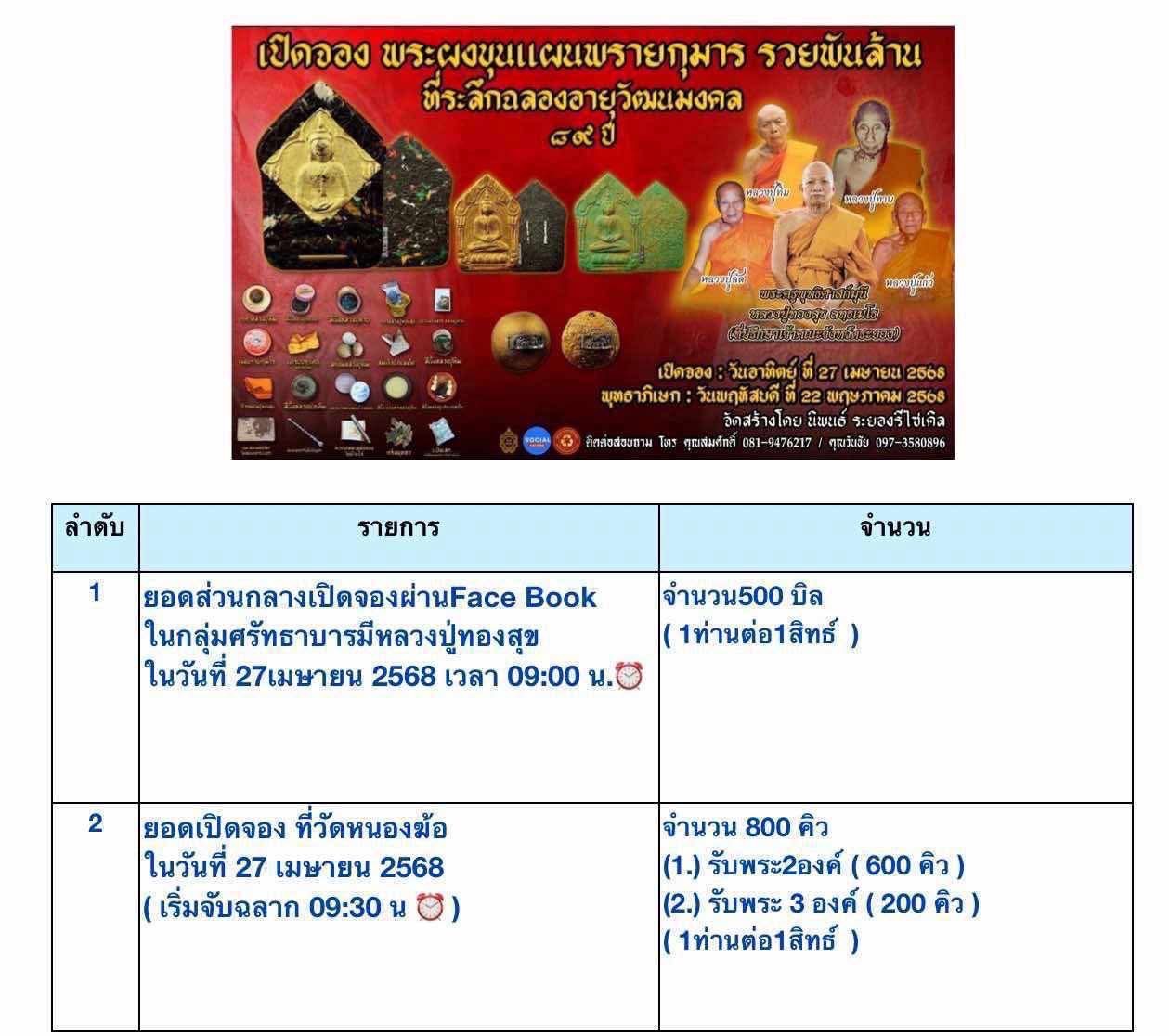 วันที่ 27 เมษายน 2568 เริ่มเข้าแถวเข้าศาลาประมาณ 8:00 นขอสงวนสิทธิ์ให้กับเด็กที่ช่วยเหลือตัวเองไม่ได้ (เช่นเด็กเล็กพ่อแม่ต้องอุ้ม)เมื่อครบจำนวน 800 คิวจะเริ่มจับสลากเป็นต้นไปครับ