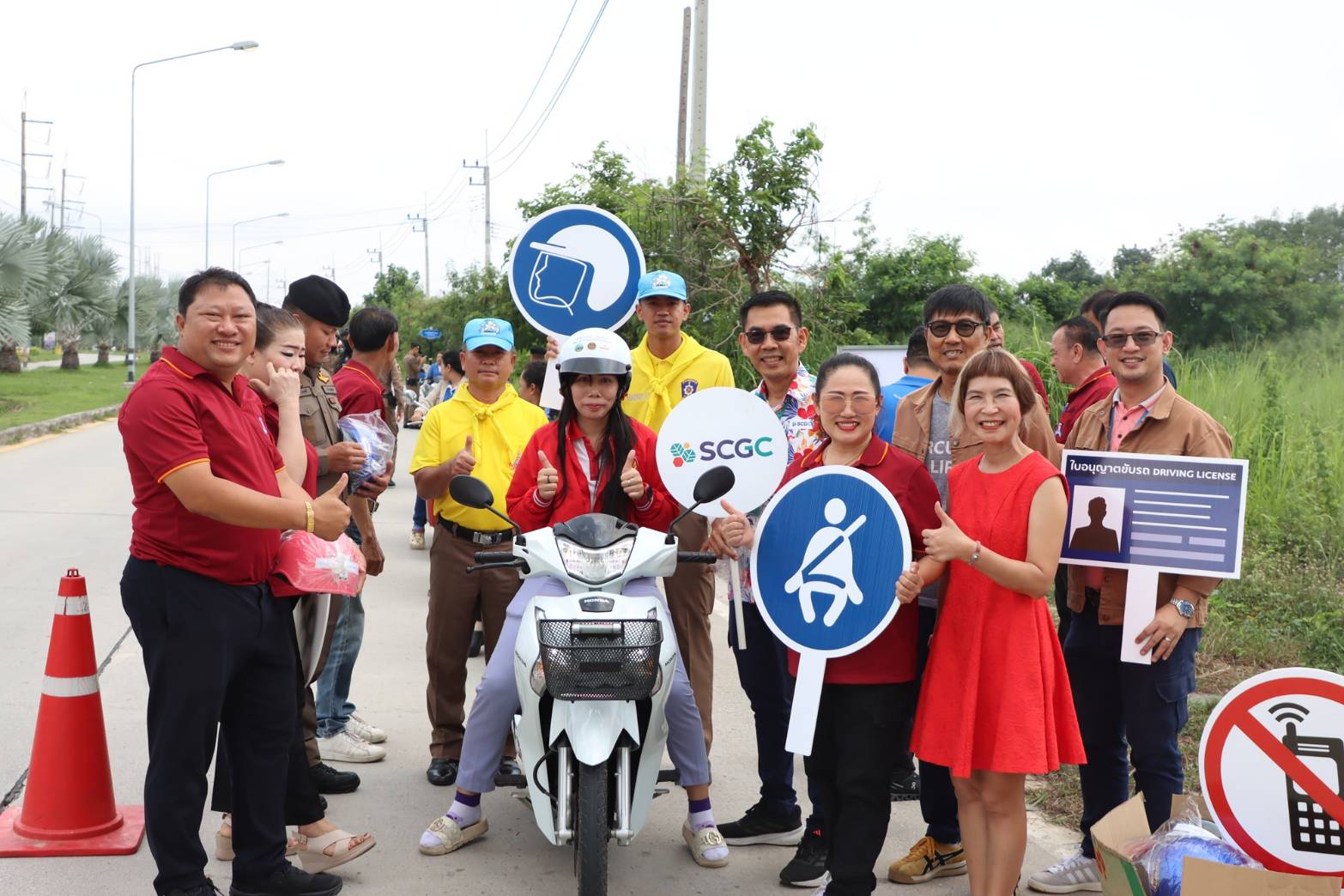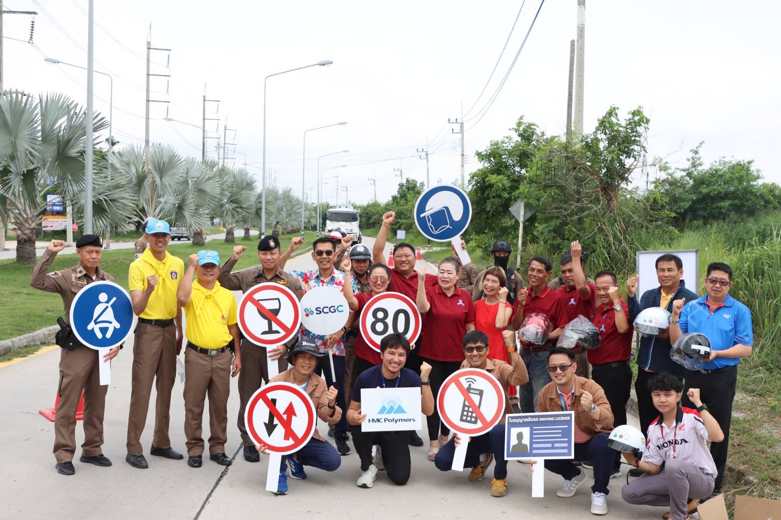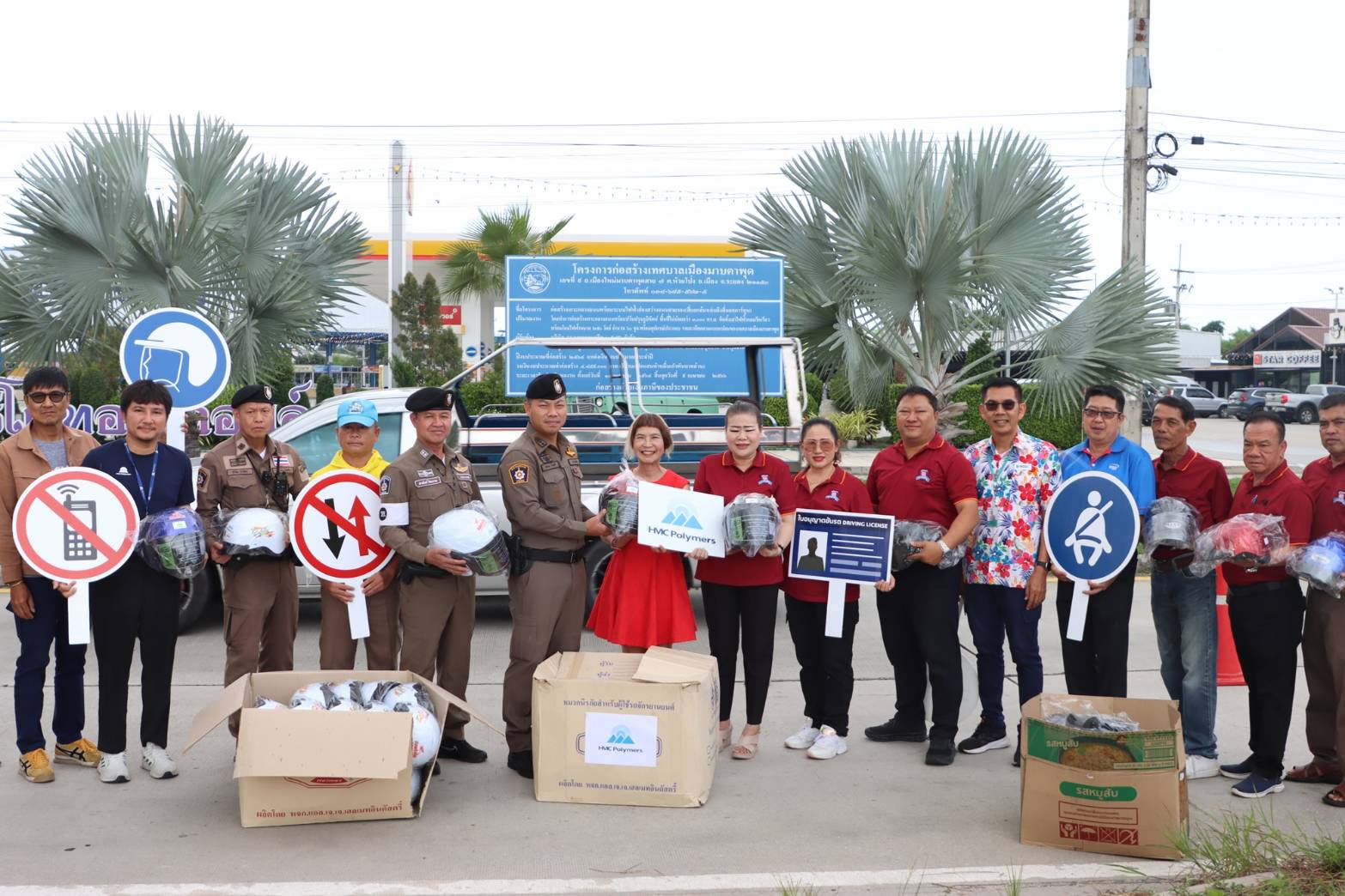 คุณบุปผาพรรณ พานทอง ผู้จัดการฝ่ายกิจการเพื่อความรับผิดชอบต่อสังคม บริษัท เอ็ชเอ็มซี โปลีเมอส์ จำกัด สนับสนุนหมวกนิรภัย มอบให้แด่พันตำรวจเอกตรงศักดิ์ เพชรหาญ ผู้กำกับสถานีตำรวจภูธรห้วยโป่ง เพื่อดำเนินในโครงการจิตอาสา (จราจร) รณรงค์การขับขี่ปลอดภัย สวมหมวกนิรภัยลดอุบัติเหตุในช่วงเทศกาลสงกรานต์ ปี 2568 เมื่อวันที่ 8 เมษายน 2568 ณ จุดบริการความปลอดภัย 7 วันระวังอันตราย สภ.ห้วยโป่ง บริเวณแยกส้มหล่น