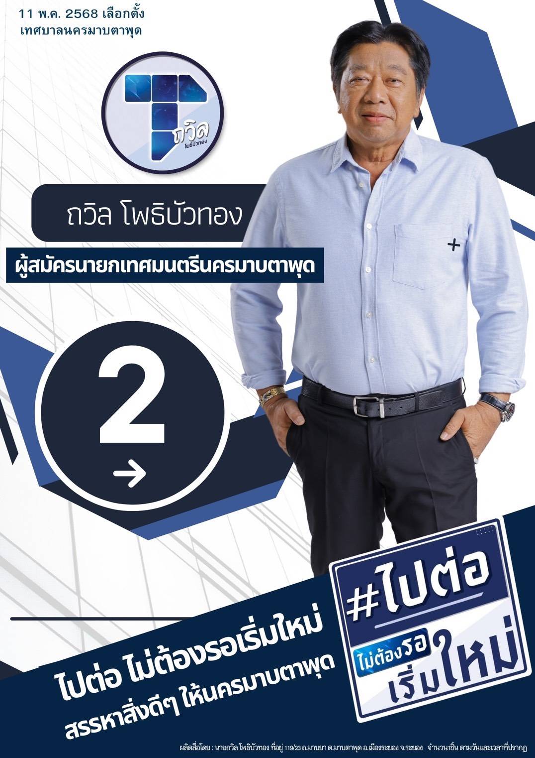 ก่อนการเลือกตั้งนายกเทศมนตรีนครมาบตาพุดเริ่มคึกคัก เมื่อ “ถวิล โพธิบัวทอง” ผู้สมัครหมายเลข 2 นำทีมผู้บริหารและสมาชิกอดีตสภาเทศบาลฯ ประกาศความพร้อมลงสนามชิงชัย โดยชูนโยบาย “ไปต่อ ไม่ต้องรอเริ่มใหม่” มุ่งมั่นสานต่องานพัฒนาเมืองสู่ยุคใหม่ที่ยั่งยืน