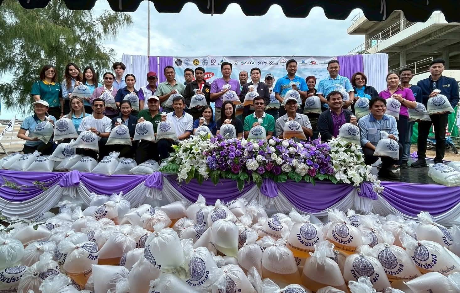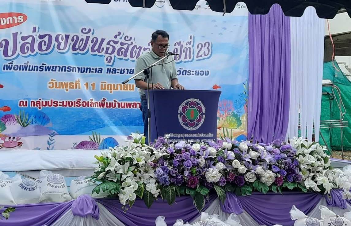 วันที่ 11 มิถุนายน 2568 สทร. ร่วมกับ วิสาหกิจชุมชนประมงเรือเล็กพื้นบ้าน อ.เมือง และ อ.บ้านฉางสามัคคีและบริษัทภาคีเครือข่าย จัดโครงการปล่อยพันธุ์สัตว์น้ำเพื่อเพิ่มทรัพยากรทางทะเลและชายฝั่ง จังหวัดระยอง ครั้งที่ 23 ประจำปี 2568 ณ กลุ่มประมงเรือเล็กพื้นบ้านพลา-อู่ตะเภา สามัคคี โดยได้รับเกียรติจาก นายกิติพงศ์ อุระวัตร นายอำเภอบ้านฉาง เป็นประธานในพิธี นายสุพัฒน์ สวัสดิ์-ชูโต ผอ.สน.ดอ. กล่าววัตถุประสงค์ของการจัดกิจกรรม มีหน่วยงานราชการ ผู้ประกอบการภาคอุตสาหกรรม และกลุ่มประมงเรือเล็กในพื้นที่ โดยสัตว์น้ำที่นำมาปล่อยได้รับการสนับสนุนจากศูนย์วิจัยและพัฒนาการเพาะเลี้ยงสัตว์น้ำชายฝั่งระยองและกลุ่มประมงเรือเล็กพลาอู่ตะเภาสามัคคีเพื่อร่วมปล่อยในครั้งนี้ด้วย สัตว์น้ำประกอบด้วย ลูกไรปู จำนวน 1,500,000 ตัว, ,แม่พันธุ์ปู จำนวน 499 ตัว,ลูกไรกุ้ง จำนวน 1,500,000 ตัว,ปลากระพงขาว จำนวน 1,000 ตัว,กุ้งแช่บ๊วย จำนวน 700,000 ตัว,หอยหวาน จำนวน 2,000 ตัว